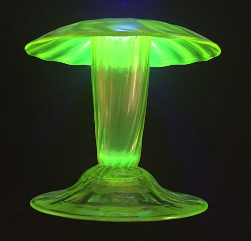 Vaseline Glass, defined as yellow-green glass that is made by adding Uranium Dioxide to the ingredients when the glass formula is made, can have a pressed pattern or be blown-moulded. Production began in the mid- to late-1800s and lasted until the mid-1940s. Vaseline Glass always turns a bright florescent green under a blacklight. The glass companies that produced antique Vaseline are too numerous to list, however a few are the same companies that produced Classic Carnival Glass and American Iridescent Stretch Glass.